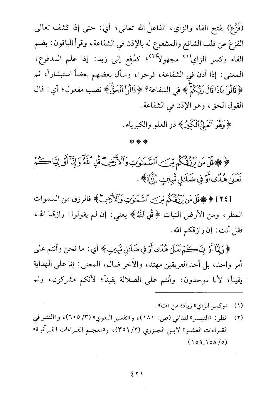 (فَزَّعَ) بفتح الفاء والزاي، الفاعلُ الله تعالى؛ أي: حتى إذا كشف تعالى الفزعَ عن قلب الشافع والمشفوع له بالإذن في الشفاعة، وقرأ الباقون: بضم الفاء وكسر الزاي (¬1) مجهولًا (¬2)؛ كدُفِع إلى زيد: إذا علم المدفوع، المعنى: إذا أذن في الشفاعة، فرحوا، وسأل بعضهم بعضًا استبشارًا، ثم {مَاذَا قَالَ رَبُّكُمْ} في الشفاعة؟ {قَالُوا الْحَقَّ} نصب مفعول؛ أي: قال القول الحق، وهو الإذن في الشفاعة.
