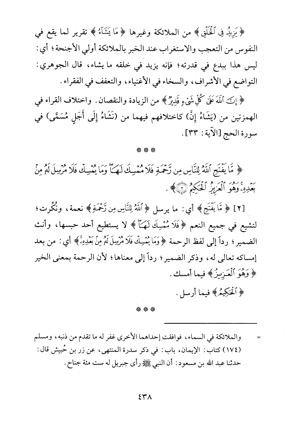 [2] {مَا يَفْتَحِ} أي: ما يرسل {اللَّهُ لِلنَّاسِ مِنْ رَحْمَةٍ} نعمة، ونُكِّرت؛ لتشيع في جميع النعم {فَلَا مُمْسِكَ لَهَا} لا يستطيع أحد حبسها، وأنث الضمير؛ ردًّا إلى لفظ الرحمة {وَمَا يُمْسِكْ فَلَا مُرْسِلَ لَهُ مِنْ بَعْدِهِ} أي: من بعد إمساكه تعالى له، وذكر الضمير؛ ردًّا إلى معناها؛ لأن الرحمة بمعنى الخير {وَهُوَ الْعَزِيزُ} فيما أمسك.