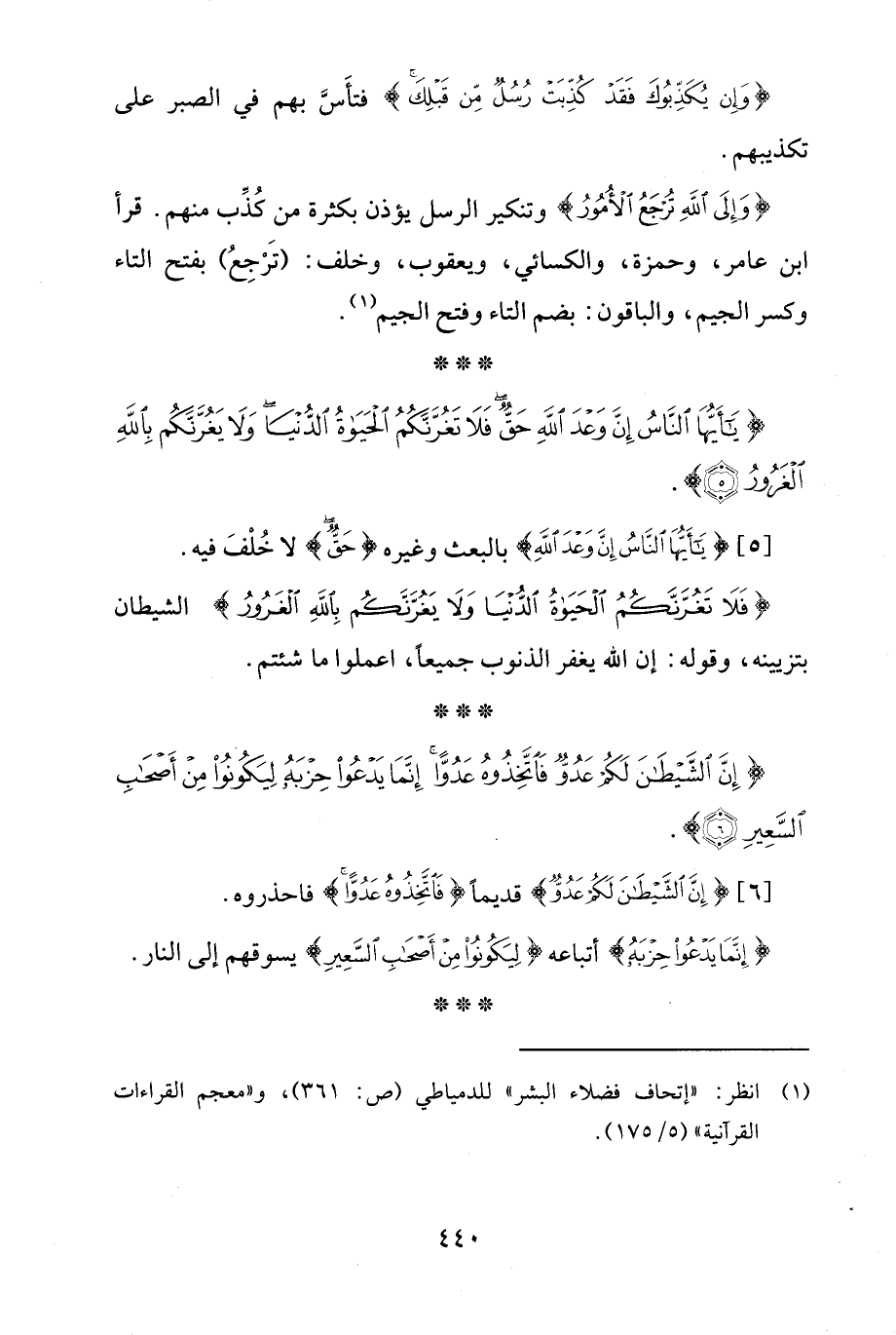 {يَاأَيُّهَا النَّاسُ إِنَّ وَعْدَ اللَّهِ حَقٌّ فَلَا تَغُرَّنَّكُمُ الْحَيَاةُ الدُّنْيَا وَلَا يَغُرَّنَّكُمْ بِاللَّهِ الْغَرُورُ (5)}.
