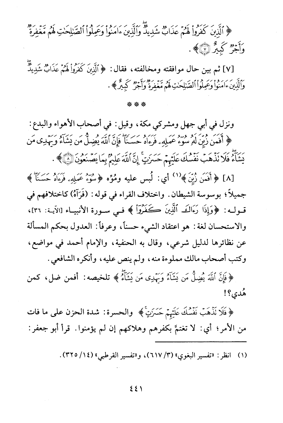 {أَفَمَنْ زُيِّنَ لَهُ سُوءُ عَمَلِهِ فَرَآهُ حَسَنًا فَإِنَّ اللَّهَ يُضِلُّ مَنْ يَشَاءُ وَيَهْدِي مَنْ يَشَاءُ فَلَا تَذْهَبْ نَفْسُكَ عَلَيْهِمْ حَسَرَاتٍ إِنَّ اللَّهَ عَلِيمٌ بِمَا يَصْنَعُونَ (8)}.