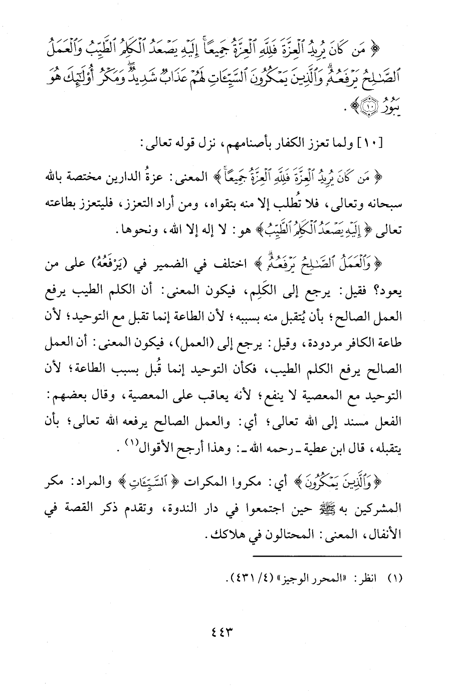 {وَالْعَمَلُ الصَّالِحُ يَرْفَعُهُ} اختلف في الضمير في (يَرْفَعُهُ) على من يعود؟ فقيل: يرجع إلى الكَلِم، فيكون المعنى: أن الكلم الطيب يرفع العمل الصالح؛ بأن يُتقبل منه بسببه؛ لأنّ الطّاعة إنّما تقبل مع التوحيد؛ لأنّ طاعة الكافر مردودة، وقيل: يرجع إلى (العمل)، فيكون المعنى: أن العمل الصالح يرفع الكلم الطيب، فكأن التّوحيد إنّما قُبل بسبب الطّاعة؛ لأنّ التّوحيد مع المعصية لا ينفع؛ لأنّه يعاقب على المعصية، وقال بعضهم: الفعل مسند إلى الله تعالى؛ أي: والعمل الصالح يرفعه الله تعالى، بأن يتقبله، قال ابن عطية -رحمه الله-: وهذا أرجح الأقوال (¬1).