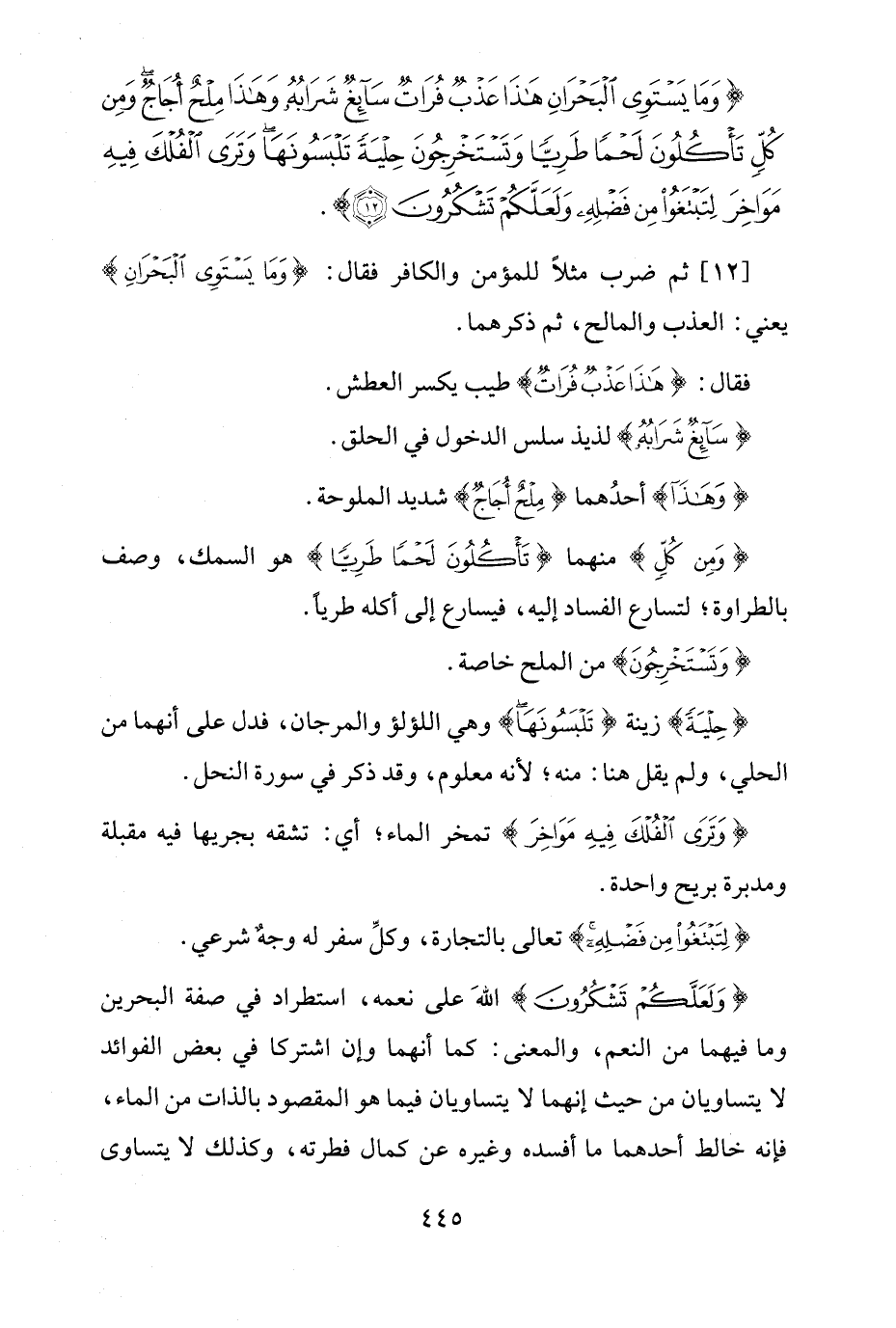 [12] ثمّ ضرب مثلًا للمؤمن والكافر فقال: {وَمَا يَسْتَوِي الْبَحْرَانِ} يعني: العذب والمالح، ثمّ ذكرهما.