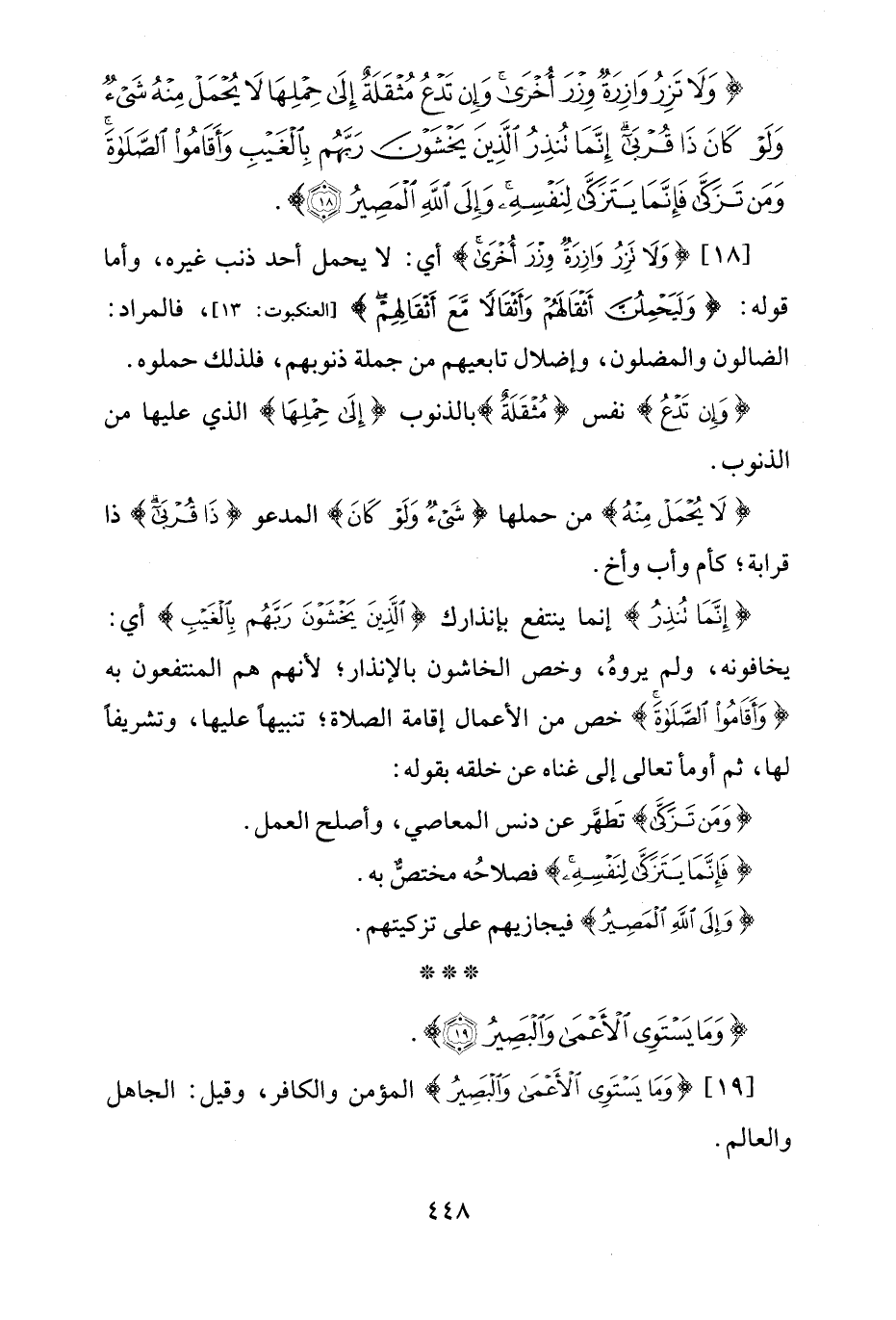 {وَلَا تَزِرُ وَازِرَةٌ وِزْرَ أُخْرَى وَإِنْ تَدْعُ مُثْقَلَةٌ إِلَى حِمْلِهَا لَا يُحْمَلْ مِنْهُ شَيْءٌ وَلَوْ كَانَ ذَا قُرْبَى إِنَّمَا تُنْذِرُ الَّذِينَ يَخْشَوْنَ رَبَّهُمْ بِالْغَيْبِ وَأَقَامُوا الصَّلَاةَ وَمَنْ تَزَكَّى فَإِنَّمَا يَتَزَكَّى لِنَفْسِهِ وَإِلَى اللَّهِ الْمَصِيرُ (18)}.