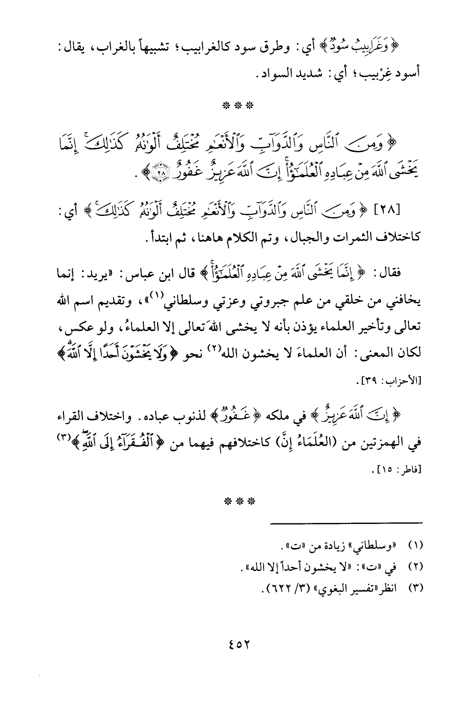 [28] {وَمِنَ النَّاسِ وَالدَّوَابِّ وَالْأَنْعَامِ مُخْتَلِفٌ أَلْوَانُهُ كَذَلِكَ} أي: كاختلاف الثمرات والجبال، وتم الكلام هاهنا، ثمّ ابتدأ.