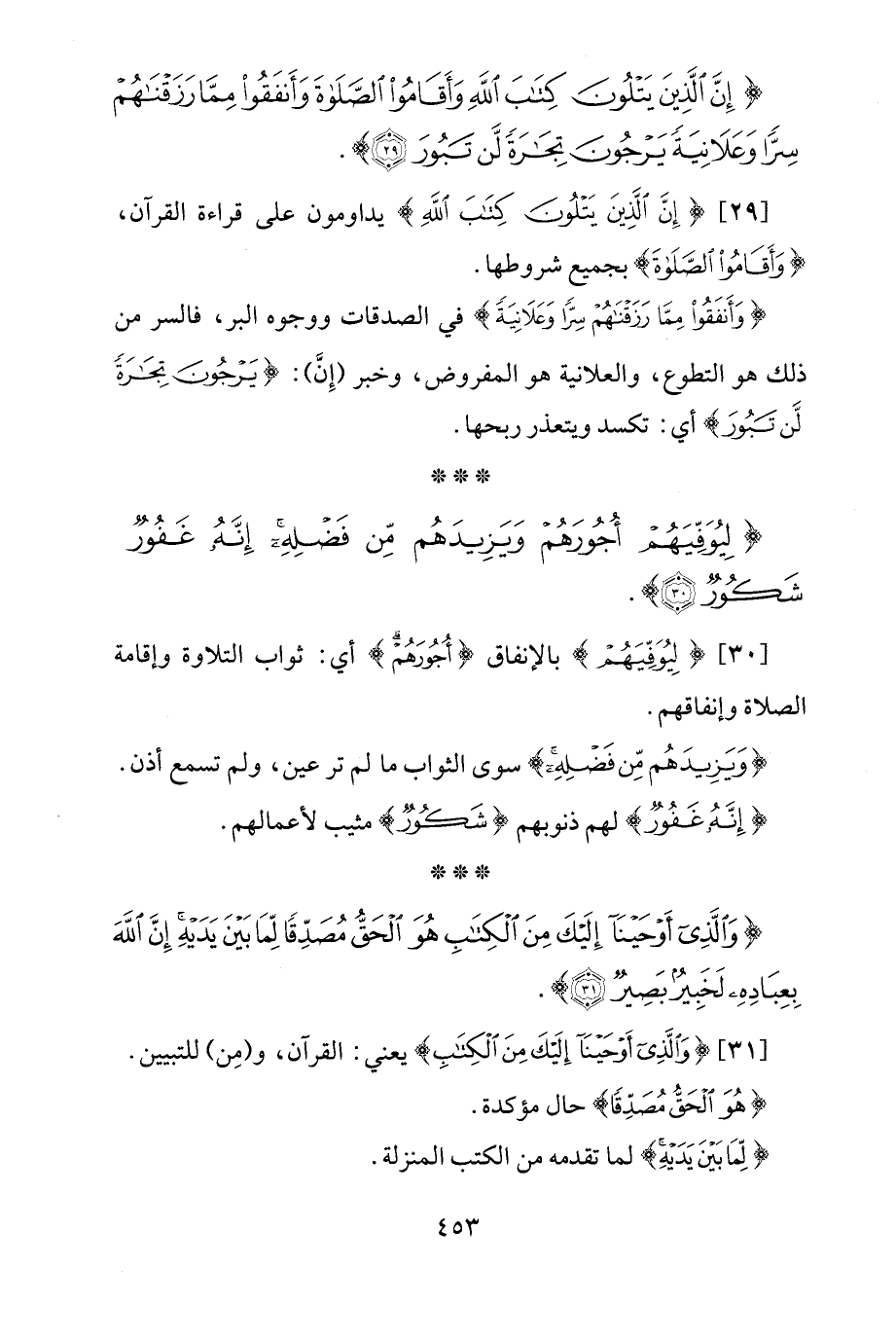 [29] {إِنَّ الَّذِينَ يَتْلُونَ كِتَابَ اللَّهِ} يداومون على قراءة القرآن، {وَأَقَامُوا الصَّلَاةَ} بجميع شروطها.
