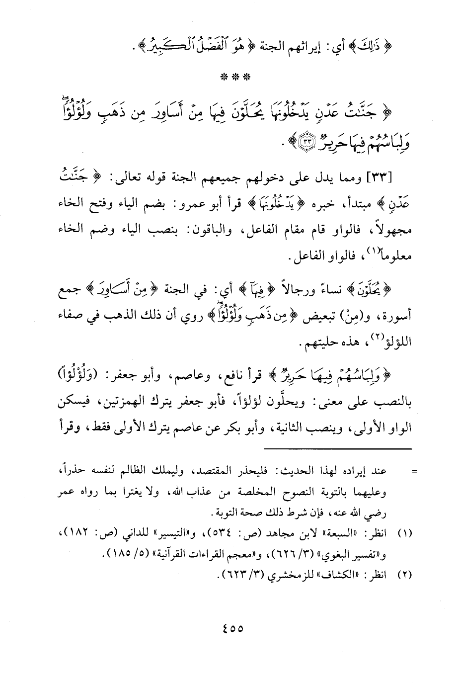 [33] ومما يدلُّ على دخولهم جميعهم الجنَّة قوله تعالى: {جَنَّاتُ عَدْنٍ} مبتدأ، خبره {يَدْخُلُونَهَا} قرأ أبو عمرو: بضم الياء وفتح الخاء مجهولًا، فالواو قام مقام الفاعل، والباقون: بنصب الياء وضم الخاء معلومًا (¬1)، فالواو الفاعل.