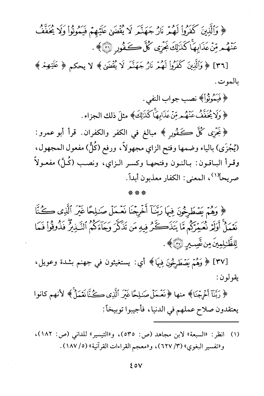 {وَالَّذِينَ كَفَرُوا لَهُمْ نَارُ جَهَنَّمَ لَا يُقْضَى عَلَيْهِمْ فَيَمُوتُوا وَلَا يُخَفَّفُ عَنْهُمْ مِنْ عَذَابِهَا كَذَلِكَ نَجْزِي كُلَّ كَفُورٍ (36)}.