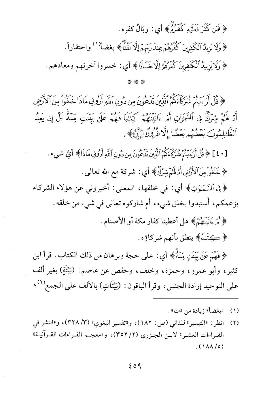 {فَهُمْ عَلَى بَيِّنَتٍ مِنْهُ} أي: على حجة وبرهان من ذلك الكتاب. قرأ ابن كثير، وأبو عمرو، وحمزة، وخلف، وحفص عن عاصم: (بَيِّنَةٍ) بغير ألف على التّوحيد إرادة الجنس، وقرأ الباقون: (بَيِّنَاتٍ) بالألف على الجمع (¬2)؛
