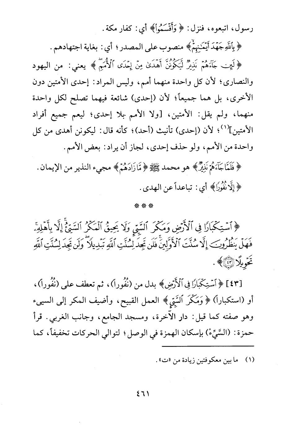[43] {اسْتِكْبَارًا فِي الْأَرْضِ} بدل من (نُفُورًا)، ثمّ تعطف على (نُفُورًا)، أو (استكبارًا)، {وَمَكْرَ السَّيِّئِ} العمل القبيح، وأضيف المكر إلى السيئ وهو صفته كما قيل: دار الآخرة، ومسجد الجامع، وجانب الغربي. قرأ حمزة: (السَّيِّءْ) بإسكان الهمزة في الوصل؛ لتوالي الحركات تخفيفًا، كما