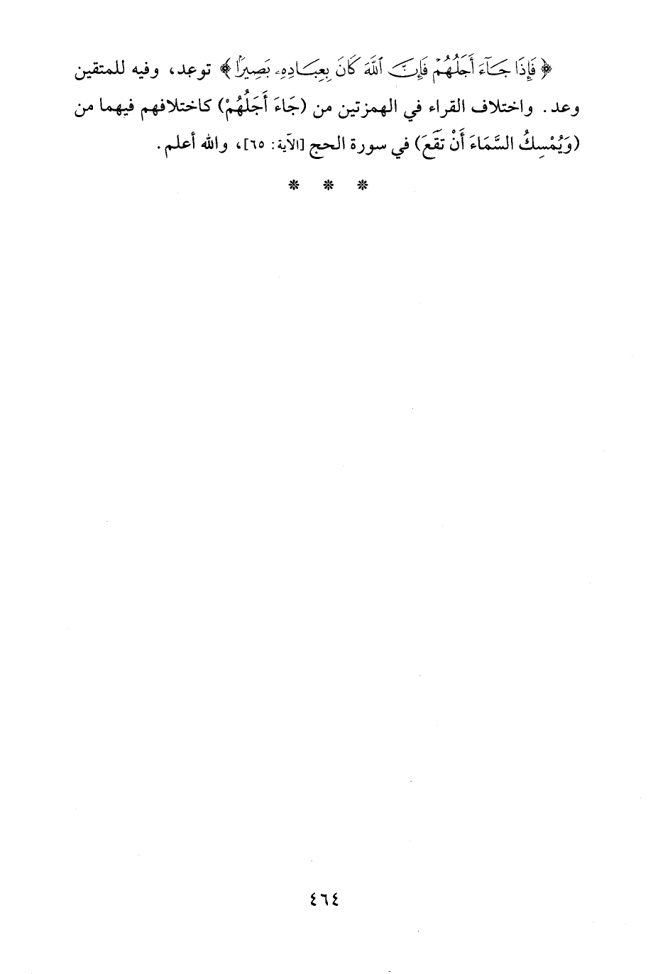 {فَإِذَا جَاءَ أَجَلُهُمْ فَإِنَّ اللَّهَ كَانَ بِعِبَادِهِ بَصِيرًا} توعد، وفيه للمتقين وعد. واختلاف القراء في الهمزتين من (جَاءَ أَجَلُهُمْ) كاختلافهم فيهما من {وَيُمْسِكُ السَّمَاءَ أَنْ تَقَعَ} في سورة الحج [الآية: 65]، والله أعلم.