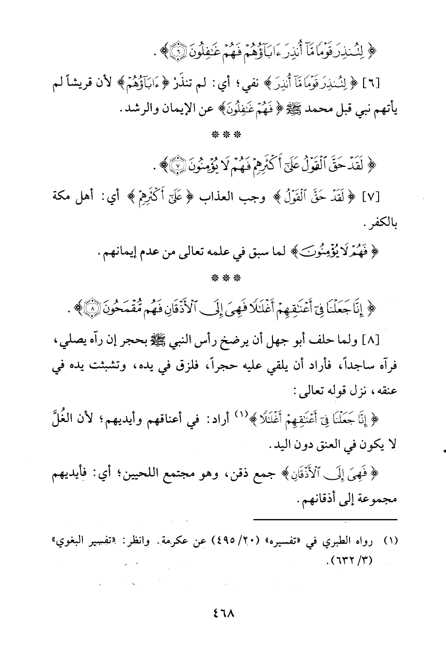 [6] {لِتُنْذِرَ قَوْمًا مَا أُنْذِرَ} نفي؛ أي: لم تنذَرْ {آبَاؤُهُمْ} لأنّ قريشًا لم يأتهم نبي قبل محمّد - صلى الله عليه وسلم - {فَهُمْ غَافِلُونَ} عن الإيمان والرشد.