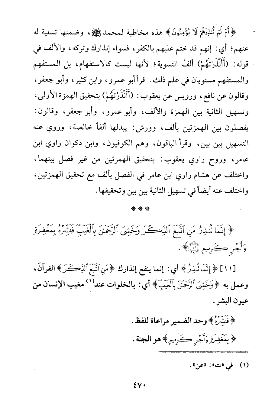 {إِنَّمَا تُنْذِرُ مَنِ اتَّبَعَ الذِّكْرَ وَخَشِيَ الرَّحْمَنَ بِالْغَيْبِ فَبَشِّرْهُ بِمَغْفِرَةٍ وَأَجْرٍ كَرِيمٍ (11)}.