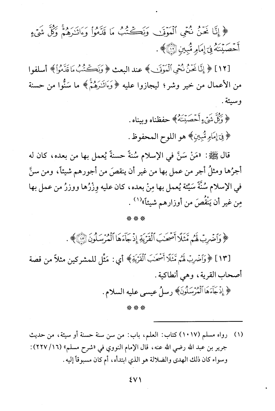 [12] {إِنَّا نَحْنُ نُحْيِ الْمَوْتَى} عند البعث {وَنَكْتُبُ مَا قَدَّمُوا} أسلفوا من الأعمال من خير وشر؛ ليجازوا عليه {وَآثَارَهُمْ} ما سَنُّوا من حسنة وسيئة.