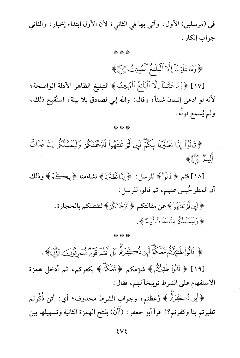 [17] {وَمَا عَلَيْنَا إِلَّا الْبَلَاغُ الْمُبِينُ} التبليغ الظّاهر الأدلة الواضحة؛ لأنّه لو ادعى إنسان شيئًا، وقال: والله إنِّي لصادق بلا بينة، استُقبح ذلك، ولم يُسمع قولُه.