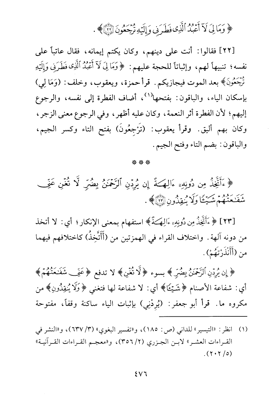 [22] فقالوا: أنت على دينهم، وكان يكتم إيمانه، فقال عاتبًا على نفسه؛ تنبيهًا لهم، وإثباتًا للحجة عليهم: {وَمَا لِيَ لَا أَعْبُدُ الَّذِي فَطَرَنِي وَإِلَيْهِ تُرْجَعُونَ} بعد الموت فيجازيكم. قرأ حمزة، ويعقوب، وخلف: (وَمَا لِي) بإسكان إلياء، والباقون: بفتحها (¬1)، أضاف الفطرة إلى نفسه، والرجوع إليهم؛ لأنّ الفطرة أثر النعمة، وكان عليه أظهر، وفي الرجوع معنى الزجر، وكان بهم أليق. وقرأ يعقوب: (تَرْجِعُونَ) بفتح التاء وكسر الجيم، والباقون: بضم التاء وفتح الجيم.