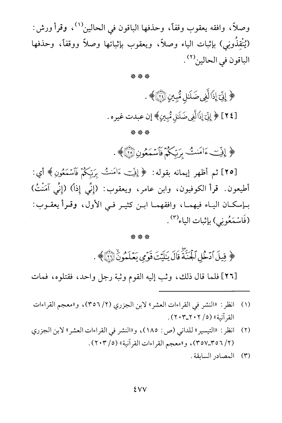 [25] ثمّ أظهر إيمانه بقوله: {إِنِّي آمَنْتُ بِرَبِّكُمْ فَاسْمَعُونِ} أي: أطيعون. قرأ الكوفيون، وابن عامر، ويعقوب: (إِنِّي إِذًا) (إِنِّي آمَنْتُ) بإسكان الياء فيهما، وافقهما ابن كثير في الأوّل، وقرأ يعقوب: (فَاسْمَعُوني) بإثبات الياء (¬3).