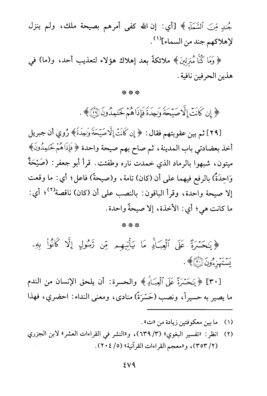 [29] ثمّ بين عقوبتهم فقال: {إِنْ كَانَتْ إِلَّا صَيْحَةً وَاحِدَةً} رُوي أن جبريل أخذ بعضادتي باب المدينة، ثمّ صاح بهم صيحة واحدة {فَإِذَا هُمْ خَامِدُونَ} ميتون، شبهوا بالرماد الّذي خمدت ناره وطفئت. قرأ أبو جعفر: (صَيْحَةٌ وَاحِدَةٌ) بالرفع فيهما على أن (كان) تامة، و (صيحةً) فاعل؛ أي: ما وقعت إِلَّا صيحة واحدة، وقرأ الباقون: بالنصب على أن (كان) ناقصة (¬2)؛ أي: ما كانت هي؛ أي: الأخذة، إِلَّا صيحةً واحدة.