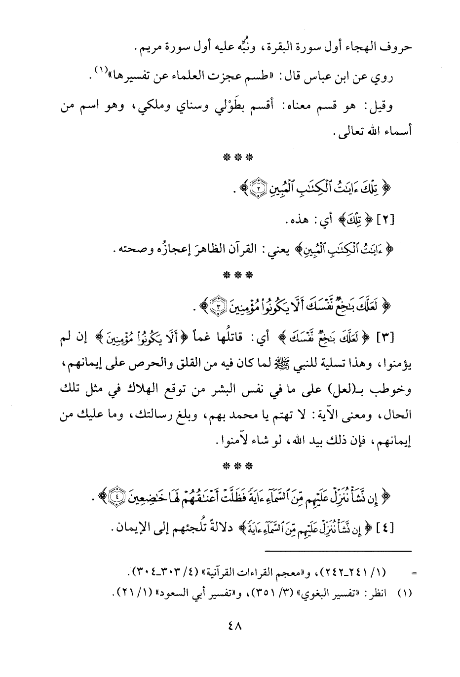 [3] {لَعَلَّكَ بَاخِعٌ نَفْسَكَ} أي: قاتلُها غمًّا {أَلَّا يَكُونُوا مُؤْمِنِينَ} إن لم يؤمنوا، وهذا تسلية للنبي - صلى الله عليه وسلم - لما كان فيه من القلق والحرص على إيمانهم، وخوطب بـ (لعل) على ما في نفس البشر من توقع الهلاك في مثل تلك الحال، ومعنى الآية: لا تهتم يا محمد بهم، وبلغ رسالتك، وما عليك من إيمانهم، فإن ذلك بيد الله، لو شاء لآمنوا.