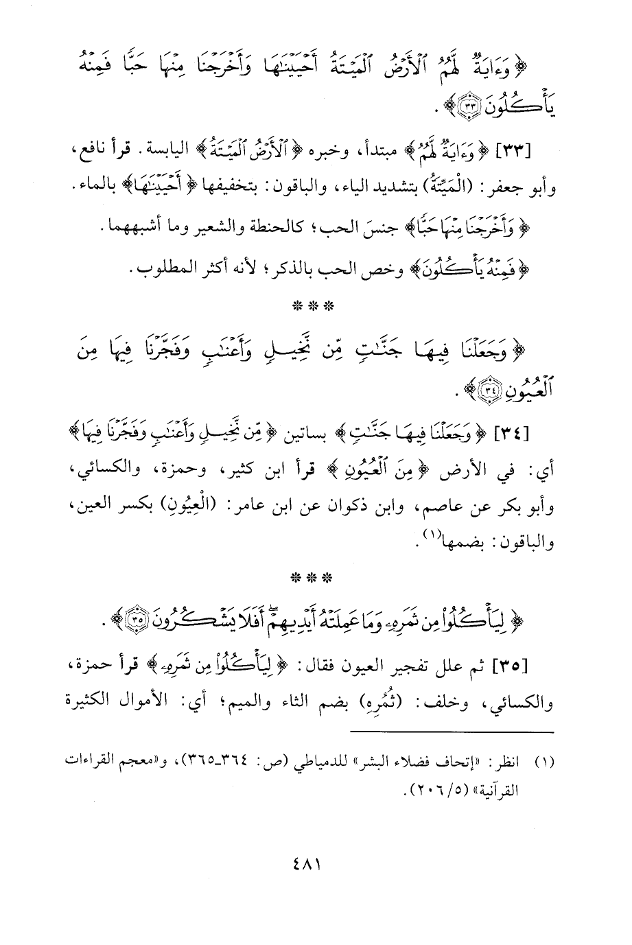 [35] ثمّ علل تفجير العيون فقال: {لِيَأْكُلُوا مِنْ ثَمَرِهِ} قرأ حمزة، والكسائي، وخلف: (ثُمُرِهِ) بضم الثاء والميم؛ أي: الأموال الكثيرة