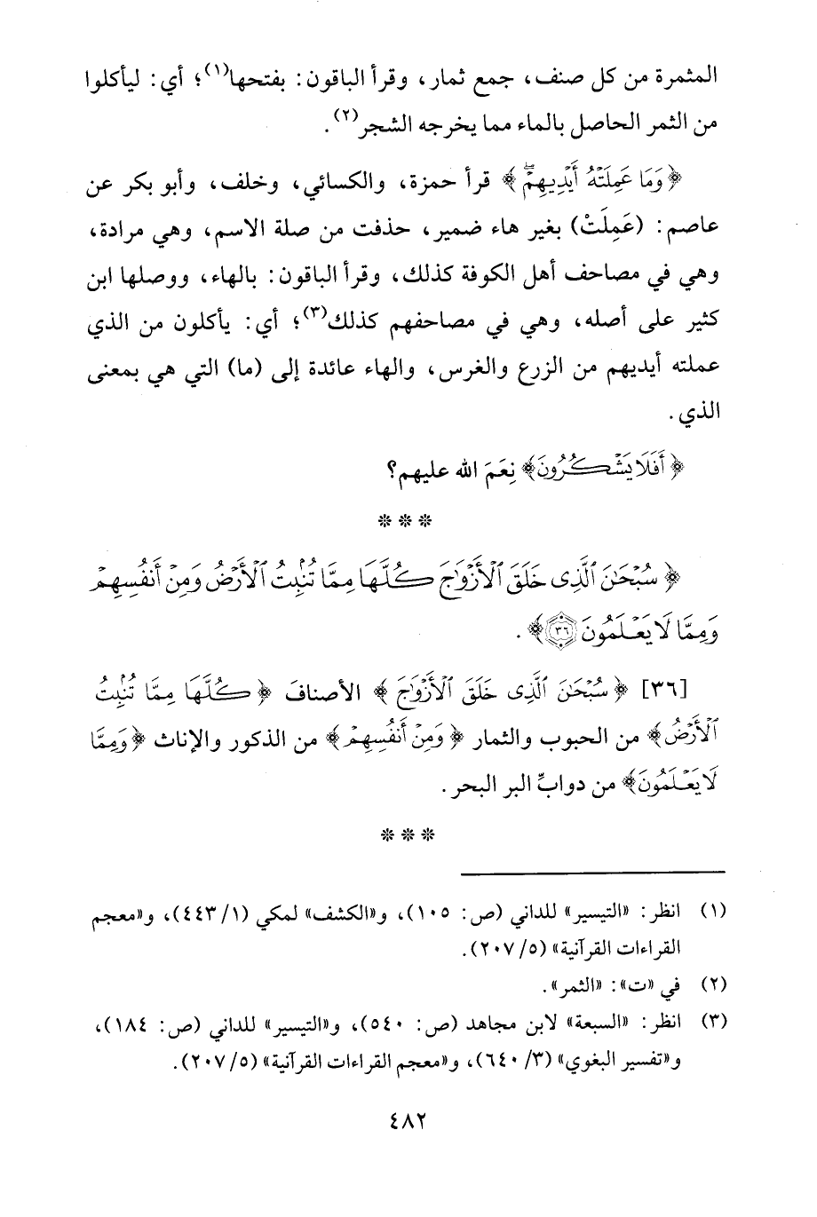 {وَمَا عَمِلَتْهُ أَيْدِيهِمْ} قرأ حمزة، والكسائي، وخلف، وأبو بكر عن عاصم: (عَمِلَتْ) بغير هاء ضمير، حذفت من صلة الاسم، وهي مرادة، وهي في مصاحف أهل الكوفة كذلك، وقرأ الباقون: بالهاء، ووصلها ابن كثير على أصله، وهي في مصاحفهم كذلك (¬3)؛ أي: يأكلون من الّذي عملته أيديهم من الزّرع والغرس، والهاء عائدة إلى (ما) الّتي هي بمعنى الّذي.