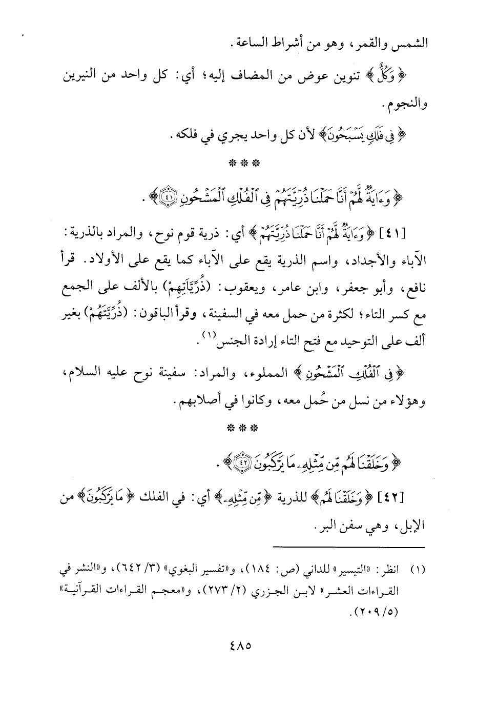 [41] {وَآيَةٌ لَهُمْ أَنَّا حَمَلْنَا ذُرِّيَّتَهُمْ} أي: ذرية قوم نوح، والمراد بالذرية: الآباء والأجداد، واسم الذرية يقع على الآباء كما يقع على الأولاد. قرأ نافع، وأبو جعفر، وابن عامر، ويعقوب: (ذُرِّيَّاتِهِمْ) بالألف على الجمع مع كسر التاء؛ لكثرة من حمل معه في السفينة، وقرأ الباقون: (ذُرِّيَّتَهُمْ) بغير ألف على التّوحيد مع فتح التاء إرادة الجنس (¬1).
