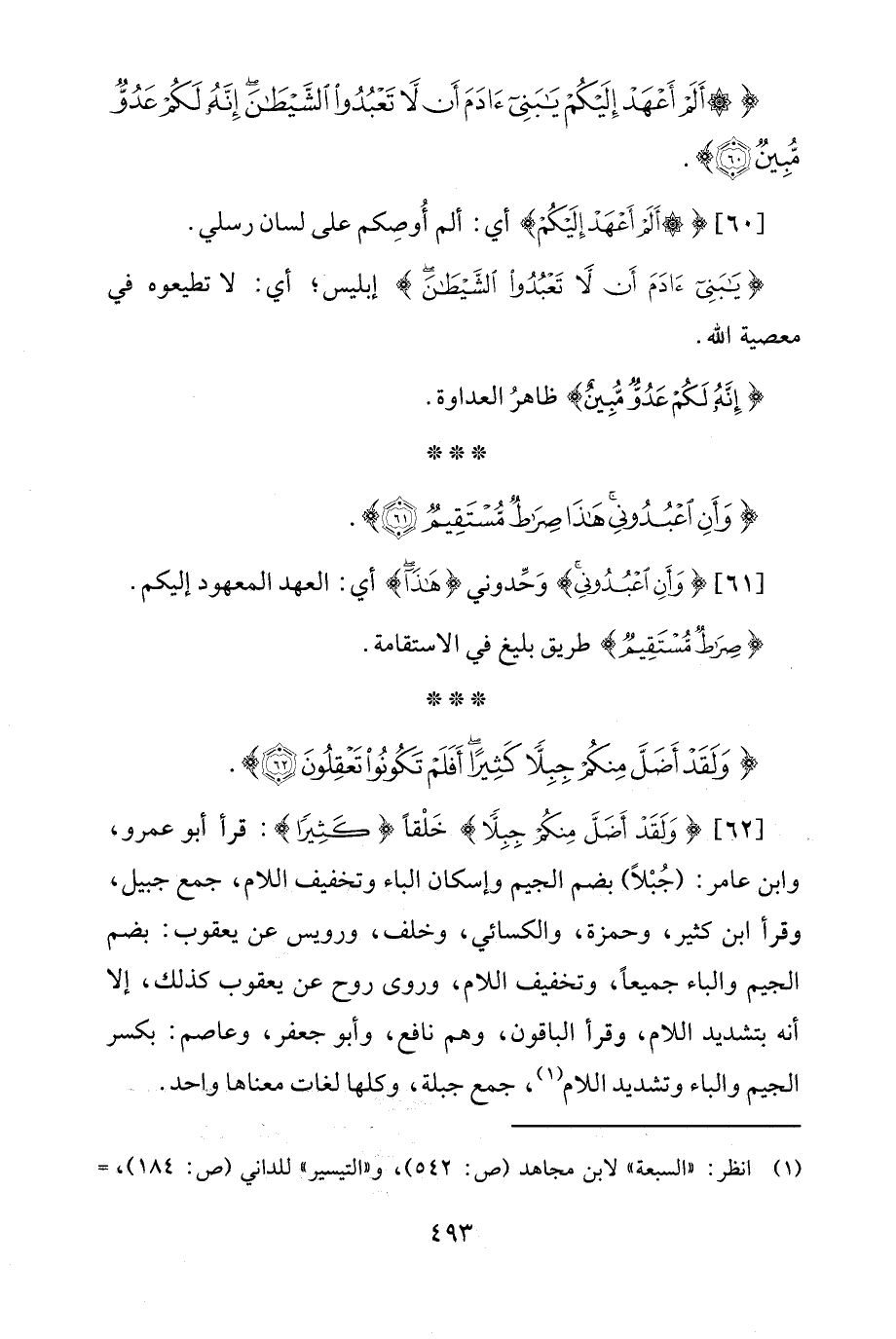 [62] {وَلَقَدْ أَضَلَّ مِنْكُمْ جِبِلًّا} خَلْقًا {كَثِيرًا}: قرأ أبو عمرو، وابن عامر: (جُبْلًا) بضم الجيم وإسكان الباء وتخفيف اللام، جمع جبيل، وقرأ ابن كثير، وحمزة، والكسائي، وخلف، ورويس عن يعقوب: بضم الجيم والباء جميعًا، وتخفيف اللام، وروى روح عن يعقوب كذلك، إلا أنه بتشديد اللام، وقرأ الباقون، وهم نافع، وأبو جعفر، وعاصم: بكسر الجيم والباء وتشديد اللام (¬1)، جمع جبلة، وكلها لغات معناها واحد.