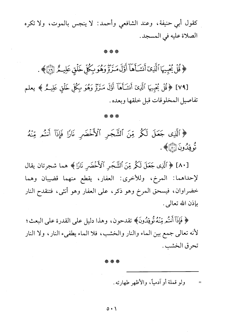 [80] {الَّذِي جَعَلَ لَكُمْ مِنَ الشَّجَرِ الْأَخْضَرِ نَارًا} هما شجرتان يقال لإحداهما: المرخ، وللأخرى: العفار، يقطع منهما قضيبان وهما خضراوان، فيسحق المرخ وهو ذكر، على العفار وهو أنثى، فتنقدح النار بإذن الله تعالى.