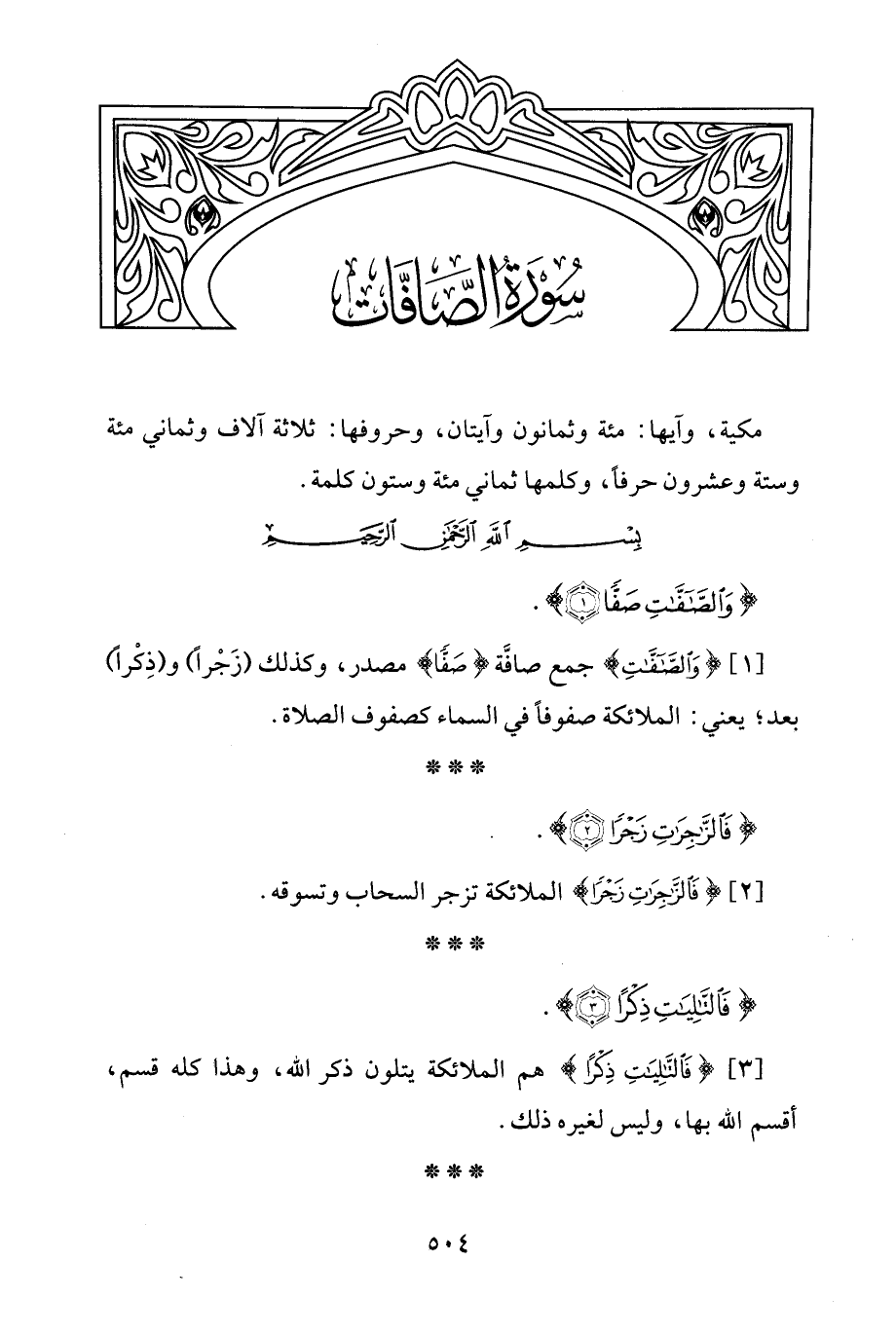 [1] {وَالصَّافَّاتِ} جمع صافَّة {صَفًّا} مصدر، وكذلك {زَجْرًا} و {ذِكْرًا} بعد؛ يعني: الملائكة صفوفًا في السماء كصفوف الصلاة.
