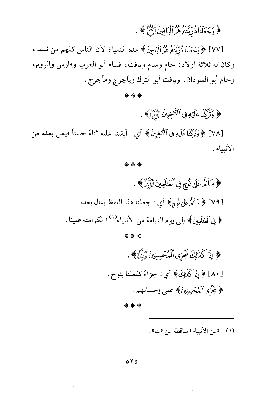[77] {وَجَعَلْنَا ذُرِّيَّتَهُ هُمُ الْبَاقِينَ} مدة الدنيا؛ لأن الناس كلهم من نسله، وكان له ثلاثة أولاد: حام وسام ويافث، فسام أبو العرب وفارس والروم، وحام أبو السودان، ويافث أبو الترك ويأجوج ومأجوج.