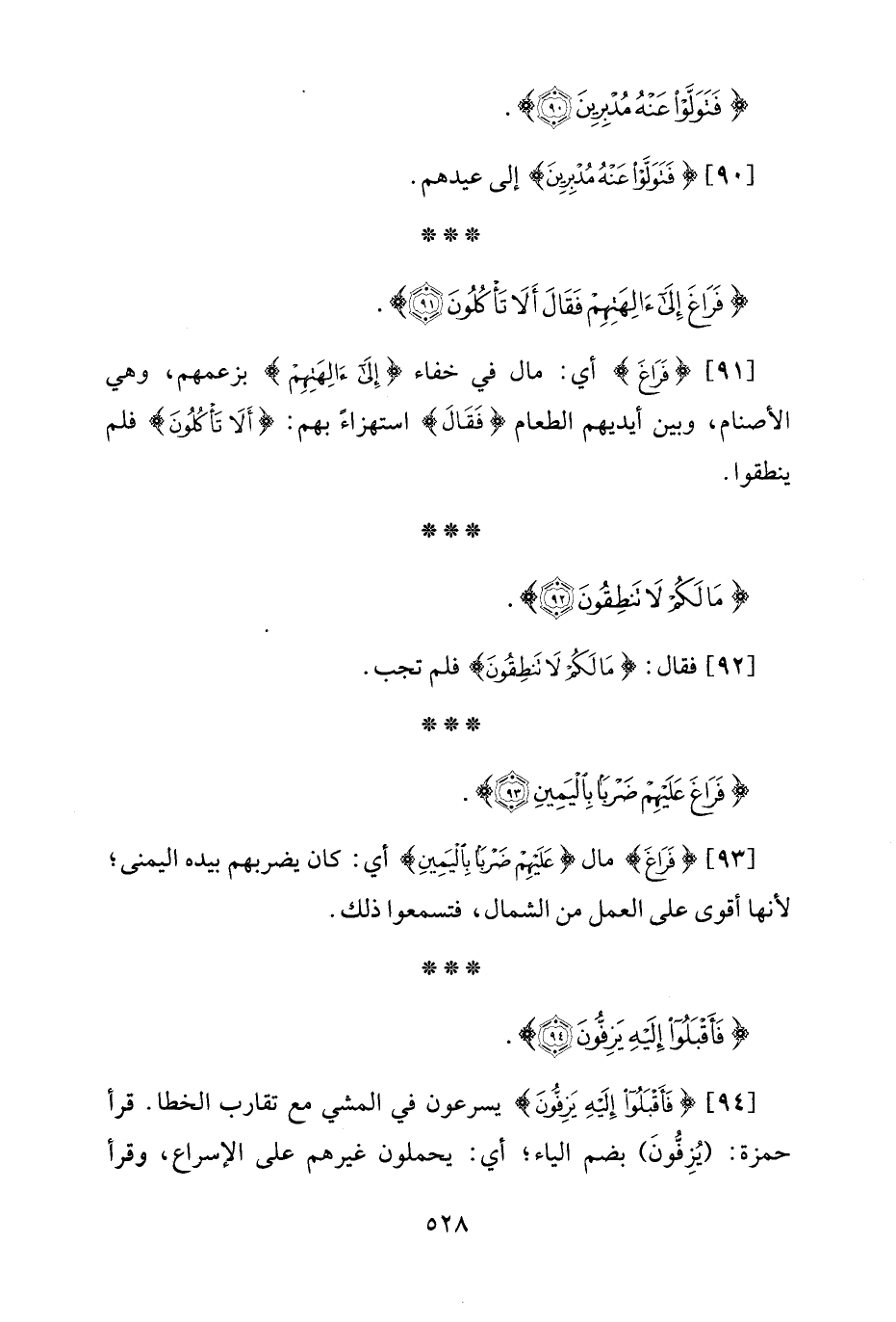 [93] {فَرَاغَ} مال {عَلَيْهِمْ ضَرْبًا بِالْيَمِينِ} أي: كان يضربهم بيده اليمنى؛ لأنها أقوى على العمل من الشمال، فتسمعوا ذلك.