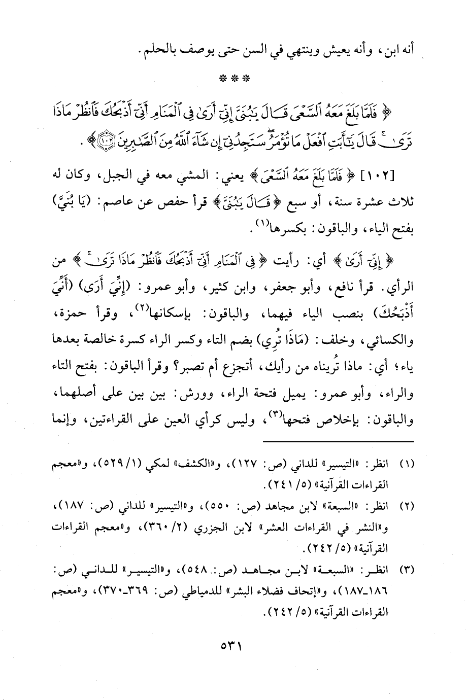 [102] {فَلَمَّا بَلَغَ مَعَهُ السَّعْيَ} يعني: المشي معه في الجبل، وكان له ثلاث عشرة سنة، أو سبع {قَالَ يَابُنَيَّ} قرأ حفص عن عاصم: (يَا بُنَيَّ) بفتح الياء، والباقون: بكسرها (¬1).