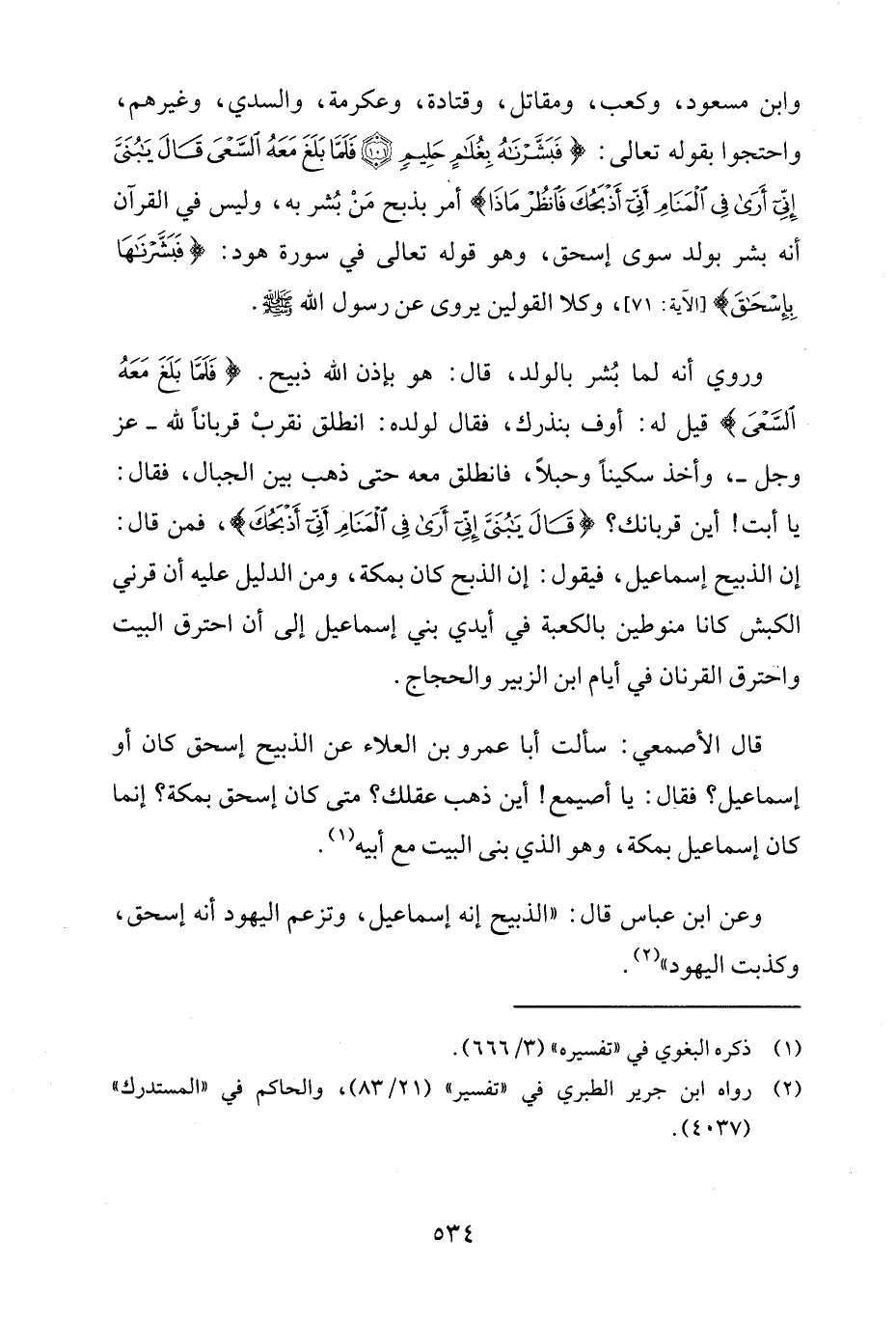 وابن مسعود، وكعب، ومقاتل، وقتادة، وعكرمة، والسدي، وغيرهم، واحتجوا بقوله تعالى: {فَبَشَّرْنَاهُ بِغُلَامٍ حَلِيمٍ (101) فَلَمَّا بَلَغَ مَعَهُ السَّعْيَ قَالَ يَابُنَيَّ إِنِّي أَرَى فِي الْمَنَامِ أَنِّي أَذْبَحُكَ فَانْظُرْ مَاذَا} أمر بذبح مَنْ بُشر به، وليس في القرآن أنه بشر بولد سوى إسحق، وهو قوله تعالى في سورة هود: {فَبَشَّرْنَاهَا بِإِسْحَاقَ} [الآية: 71]، وكلا القولين يروى عن رسول الله - صلى الله عليه وسلم -.