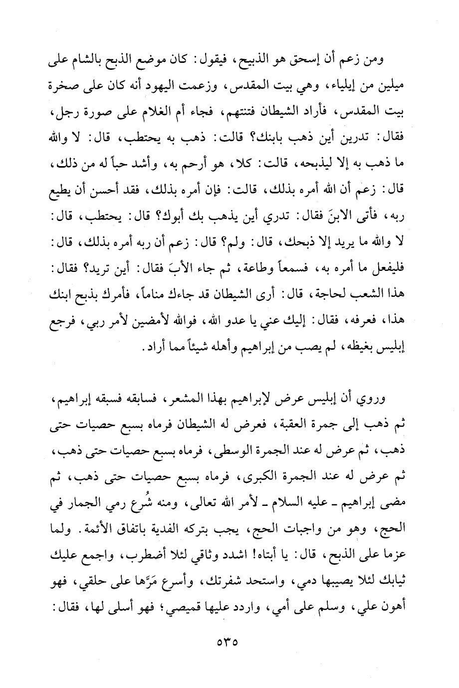 ومن زعم أن إسحق هو الذبيح، فيقول: كان موضع الذبح بالشام على ميلين من إيلياء، وهي بيت المقدس، وزعمت اليهود أنه كان على صخرة بيت المقدس، فأراد الشيطان فتنتهم، فجاء أم الغلام على صورة رجل، فقال: تدرين أين ذهب بابنك؟ قالت: ذهب به يحتطب، قال: لا والله ما ذهب به إلا ليذبحه، قالت: كلا، هو أرحم به، وأشد حبًّا له من ذلك، قال: زعم أن الله أمره بذلك، قالت: فإن أمره بذلك، فقد أحسن أن يطيع ربه، فأتى الابنَ فقال: تدري أين يذهب بك أبوك؟ قال: يحتطب، قال: لا والله ما يريد إلا ذبحك، قال: ولم؟ قال: زعم أن ربه أمره بذلك، قال: فليفعل ما أمره به، فسمعًا وطاعة، ثم جاء الأبَ فقال: أين تريد؟ فقال: هذا الشعب لحاجة، قال: أرى الشيطان قد جاءك منامًا، فأمرك بذبح ابنك هذا، فعرفه، فقال: إليك عني يا عدو الله، فوالله لأمضين لأمر ربي، فرجع إبليس بغيظه، لم يصب من إبراهيم وأهله شيئًا مما أراد.