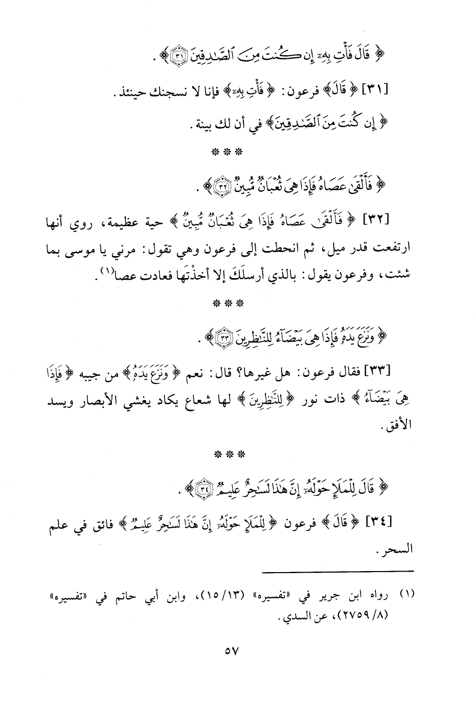 [32] {فَأَلْقَى عَصَاهُ فَإِذَا هِيَ ثُعْبَانٌ مُبِينٌ} حية عظيمة، روي أنها ارتفعت قدر ميل، ثم انحطت إلى فرعون وهي تقول: مرني يا موسى بما شئت، وفرعون يقول: بالذي أرسلَكَ إلا أخذْتَها فعادت عصا (¬1).