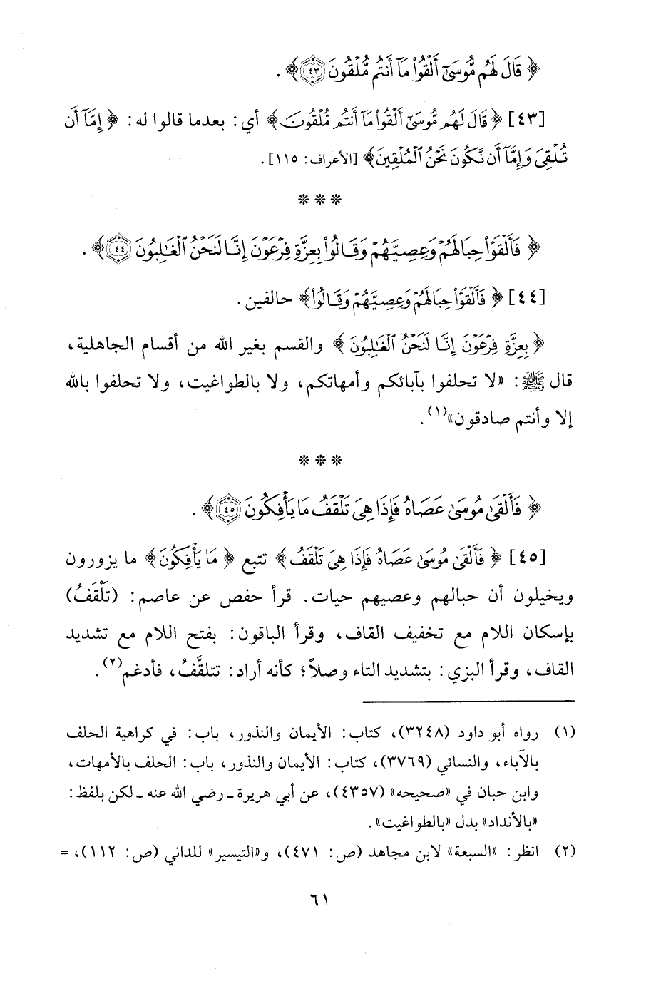 [45] {فَأَلْقَى مُوسَى عَصَاهُ فَإِذَا هِيَ تَلْقَفُ} تتبع {مَا يَأْفِكُونَ} ما يزورون ويخيلون أن حبالهم وعصيهم حيات. قرأ حفص عن عاصم: (تَلْقَفُ) بإسكان اللام مع تخفيف القاف، وقرأ الباقون: بفتح اللام مع تشديد القاف، وقرأ البزي: بتشديد التاء وصلًا؛ كأنه أراد: تتلقَّفُ، فأدغم (¬2).