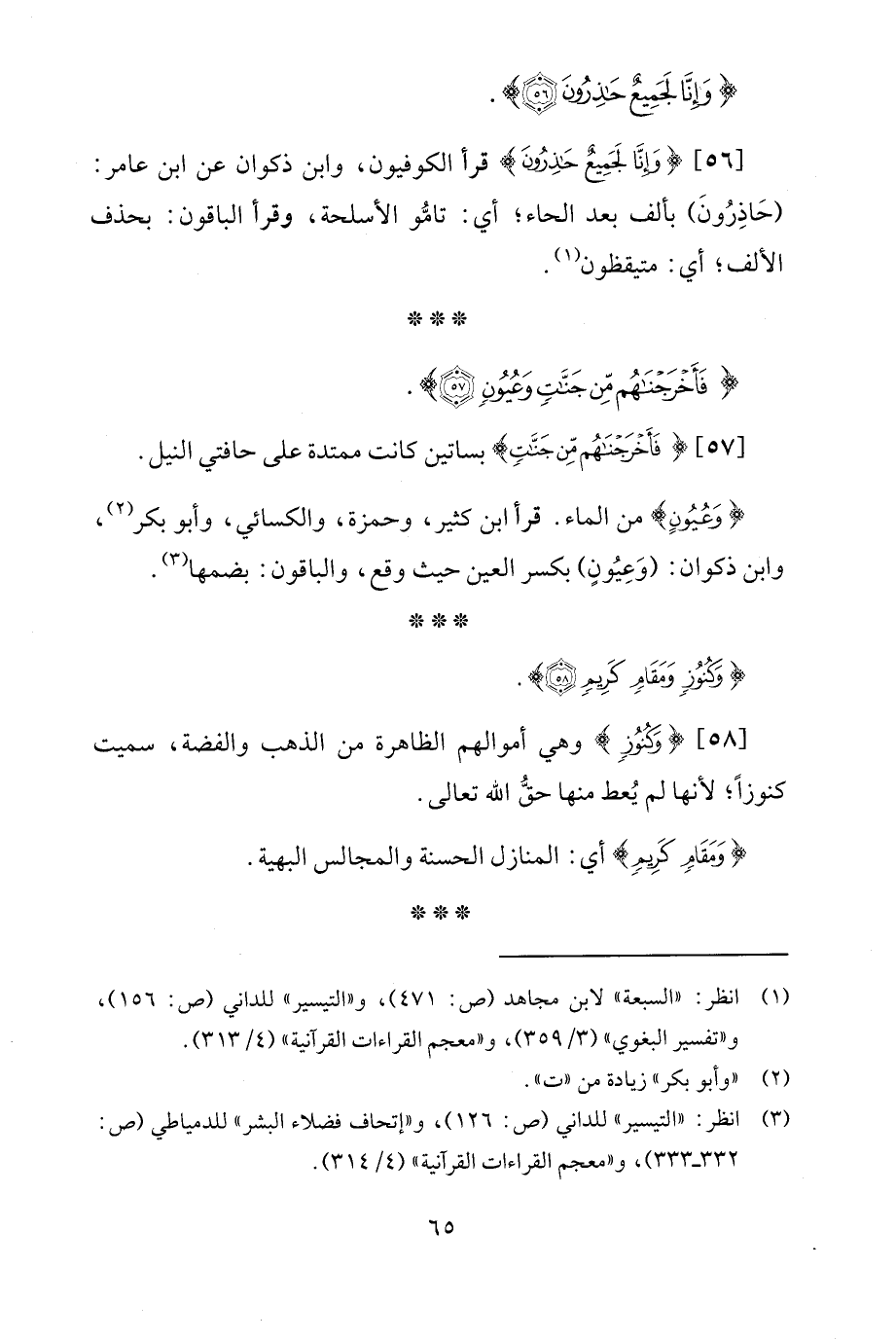 [56] {وَإِنَّا لَجَمِيعٌ حَاذِرُونَ} قرأ الكوفيون، وابن ذكوان عن ابن عامر: (حَاذِرُونَ) بألف بعد الحاء؛ أي: تامُّو الأسلحة، وقرأ الباقون: بحذف الألف؛ أي: متيقظون (¬1).