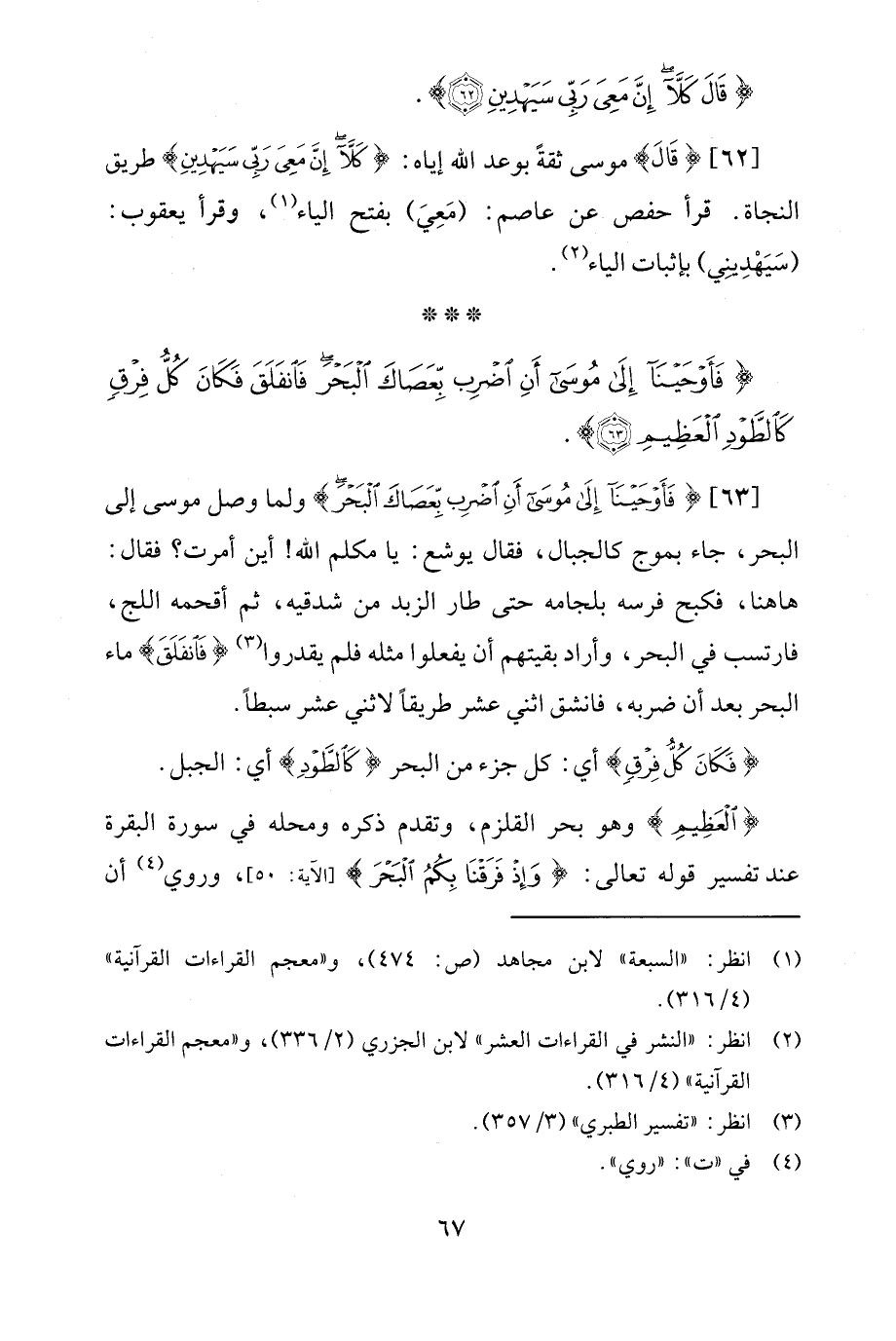 [63] {فَأَوْحَيْنَا إِلَى مُوسَى أَنِ اضْرِبْ بِعَصَاكَ الْبَحْرَ} ولما وصل موسى إلى البحر، جاء بموج كالجبال، فقال يوشع: يا مكلم الله! أين أمرت؟ فقال: هاهنا، فكبح فرسه بلجامه حتى طار الزبد من شدقيه، ثم أقحمه اللج، فارتسب في البحر، وأراد بقيتهم أن يفعلوا مثله فلم يقدروا (¬3) {فَانْفَلَقَ} ماء البحر بعد أن ضربه، فانشق اثني عشر طريقًا لاثني عشر سبطًا.