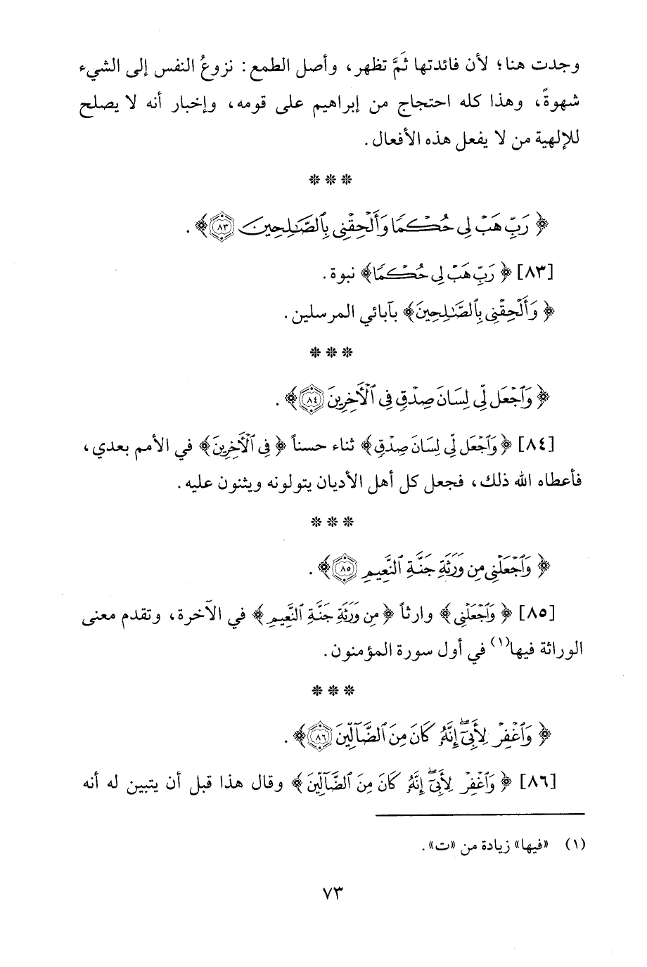 [85] {وَاجْعَلْنِي} وارثًا {مِنْ وَرَثَةِ جَنَّةِ النَّعِيمِ} في الآخرة، وتقدم معنى الوراثة فيها (¬1) في أول سورة المؤمنون.
