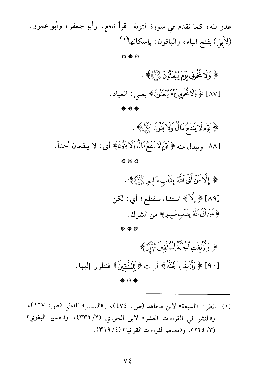 (¬1) انظر: "السبعة" لابن مجاهد (ص: 474)، و"التيسير" للداني (ص: 167)، و"النشر في القراءات العشر" لابن الجزري (2/ 336)، و"تفسير البغوي" (3/ 224)، و"معجم القراءات القرآنية" (4/ 319).
