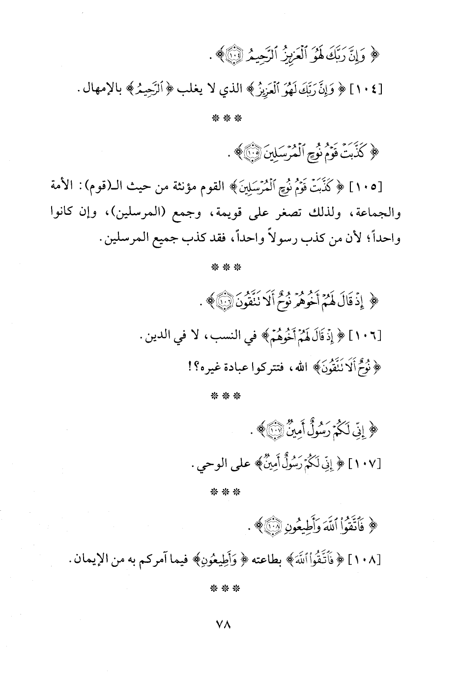 [105] {كَذَّبَتْ قَوْمُ نُوحٍ الْمُرْسَلِينَ} القوم مؤنثة من حيث الـ (قوم): الأمة والجماعة، ولذلك تصغر على قويمة، وجمع (المرسلين)، وإن كانوا واحدًا؛ لأن من كذب رسولًا واحدًا، فقد كذب جميع المرسلين.