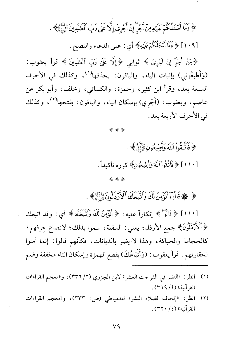 {مِنْ أَجْرٍ إِنْ أَجْرِيَ} ثوابي {إِلَّا عَلَى رَبِّ الْعَالَمِينَ} قرأ يعقوب: (وَأَطِيعُوني) بإثبات الياء، والباقون: بحذفها (¬1)، وكذلك في الأحرف السبعة بعد، وقرأ ابن كثير، وحمزة، والكسائي، وخلف، وأبو بكر عن عاصم، ويعقوب: (أَجْرِي) بإسكان الياء، والباقون: بفتحها (¬2)، وكذلك في الأحرف الأربعة بعد.