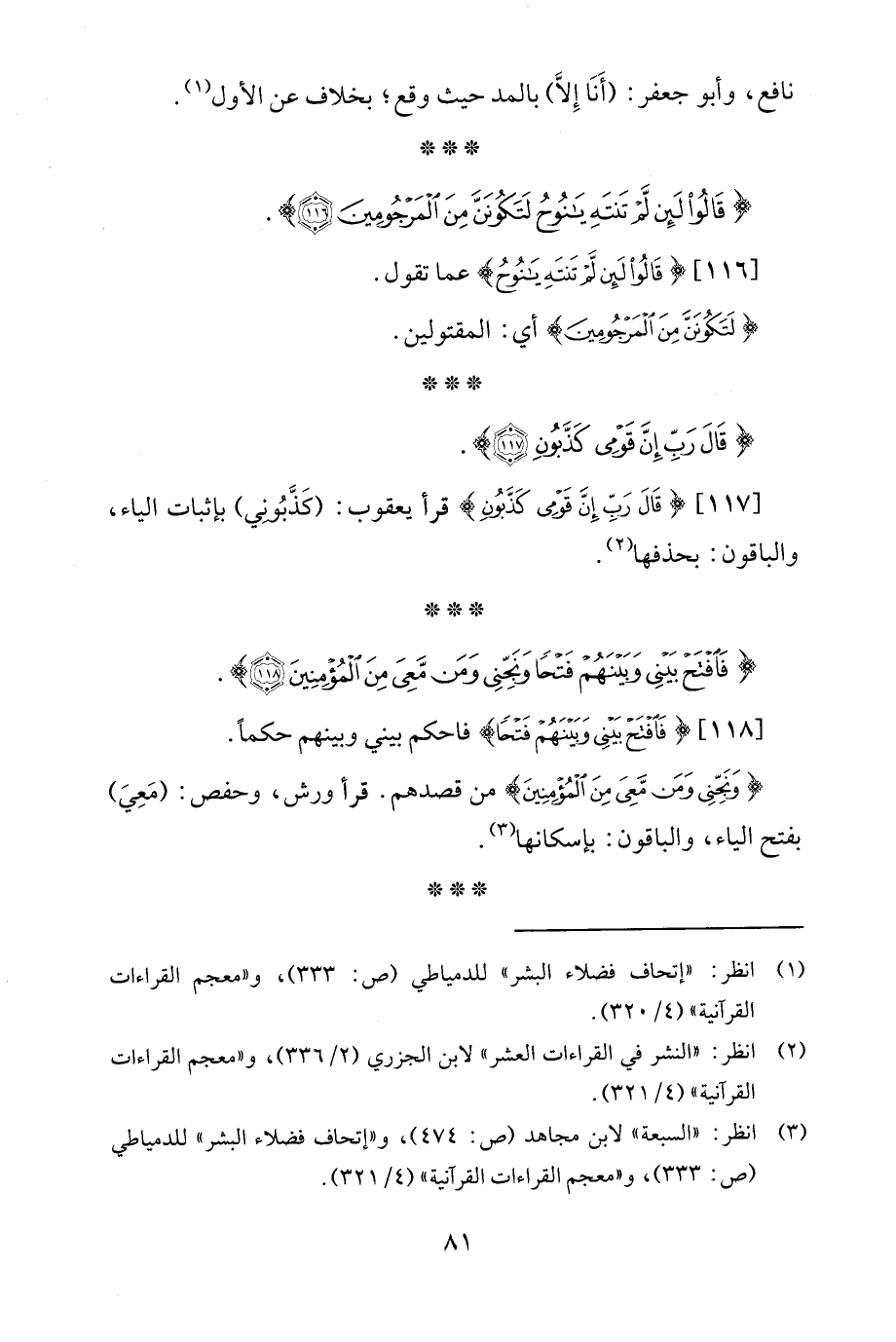 [117] {قَالَ رَبِّ إِنَّ قَوْمِي كَذَّبُونِ} قرأ يعقوب: (كَذَّبُونِي) بإثبات الياء، والباقون: بحذفها (¬2).