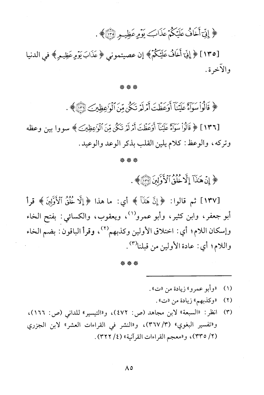 [137] ثم قالوا: {إِنْ هَذَا} أي: ما هذا {إِلَّا خُلُقُ الْأَوَّلِينَ} قرأ أبو جعفر، وابن كثير، وأبو عمرو (¬1)، ويعقوب، والكسائي: بفتح الخاء وإسكان اللام؛ أي: اختلاق الأولين وكذبهم (¬2)، وقرأ الباقون: بضم الخاء واللام؛ أي: عادة الأولين من قبلنا (¬3).