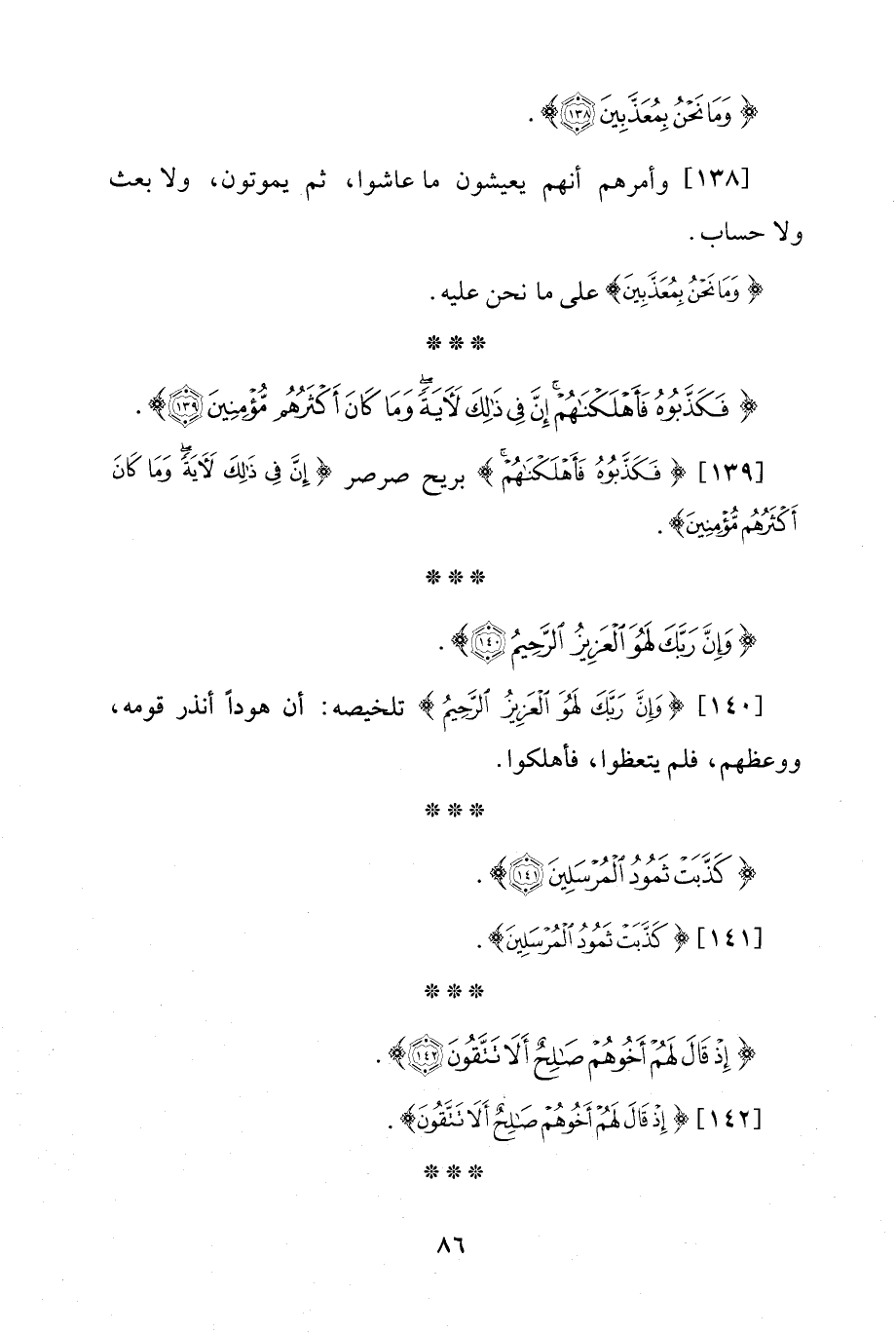 [140] {وَإِنَّ رَبَّكَ لَهُوَ الْعَزِيزُ الرَّحِيمُ} تلخيصه: أن هودًا أنذر قومه، ووعظهم، فلم يتعظوا، فأهلكوا.