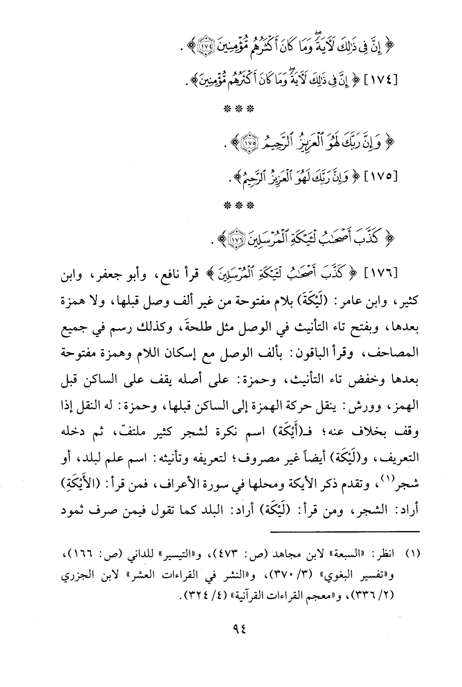 [176] {كَذَّبَ أَصْحَابُ الْأَيْكَةِ الْمُرْسَلِينَ} قرأ نافع، وأبو جعفر، وابن كثير، وابن عامر: (لَيْكَةَ) بلام مفتوحة من غير ألف وصل قبلها، ولا همزة بعدها، وبفتح تاء التأنيث في الوصل مثل طلحةَ، وكذلك رسم في جميع المصاحف، وقرأ الباقون: بألف الوصل مع إسكان اللام وهمزة مفتوحة بعدها وخفض تاء التأنيث، وحمزة: على أصله يقف على الساكن قبل الهمز، وورش: ينقل حركة الهمزة إلى الساكن قبلها، وحمزة: له النقل إذا وقف بخلاف عنه؛ فـ (أَيْكَة) اسم نكرة لشجر كثير ملتفّ، ثم دخله التعريف، و (لَيْكَة) أيضًا غير مصروف؛ لتعريفه وتأنيثه: اسم علم لبلد، أو شجر (¬1)، وتقدم ذكر الأيكة ومحلها في سورة الأعراف، فمن قرأ: (الأَيْكَةِ) أراد: الشجر، ومن قرأ: (لَيْكَة) أراد: البلد كما تقول فيمن صرف ثمود