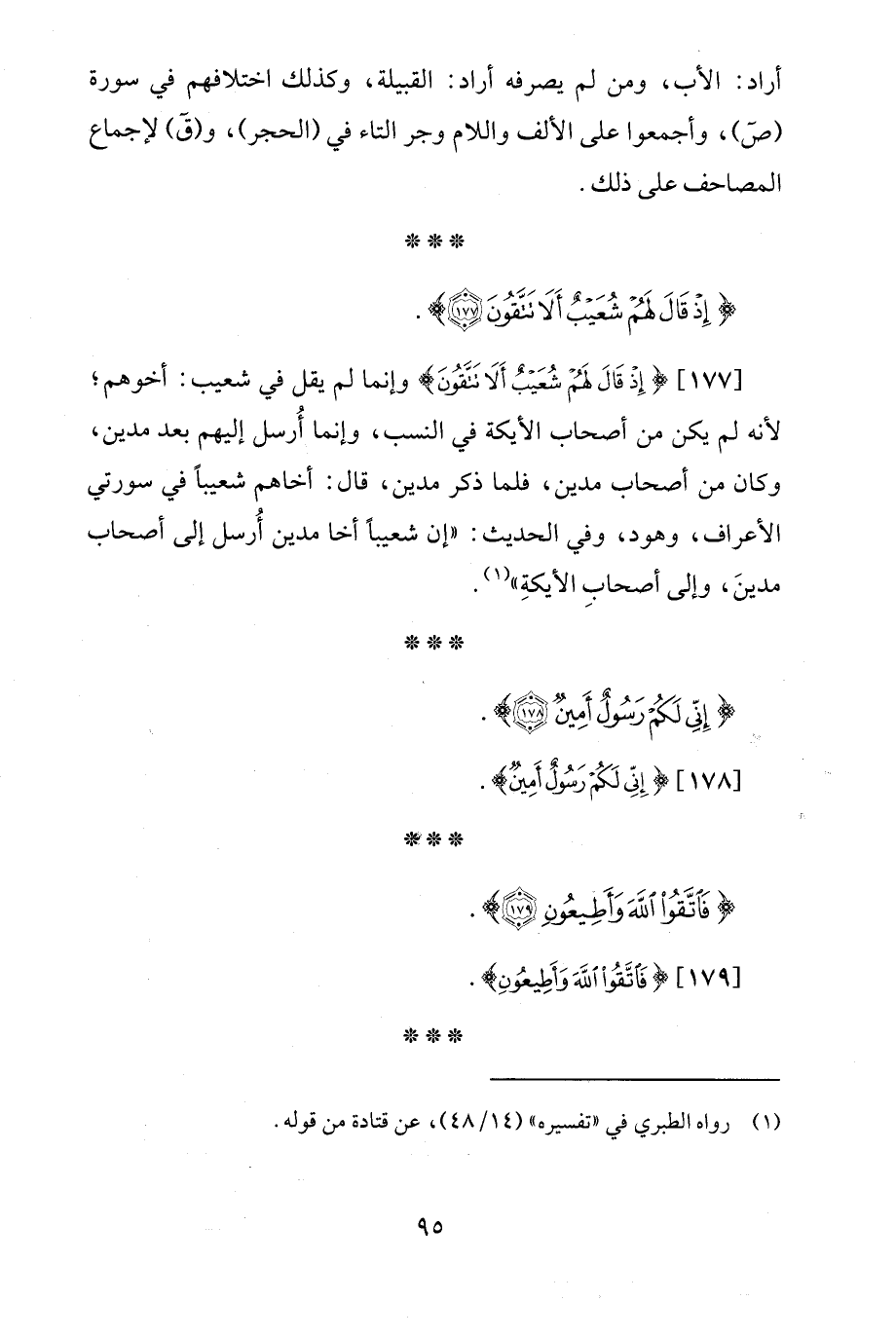 [177] {إِذْ قَالَ لَهُمْ شُعَيْبٌ أَلَا تَتَّقُونَ} وإنما لم يقل في شعيب: أخوهم؛ لأنه لم يكن من أصحاب الأيكة في النسب، وإنما أُرسل إليهم بعد مدين، وكان من أصحاب مدين، فلما ذكر مدين، قال: أخاهم شعيبًا في سورتي الأعراف، وهود، وفي الحديث: "إن شعيبًا أخا مدين أُرسل إلى أصحاب مدينَ، وإلى أصحابِ الأيكةِ" (¬1).