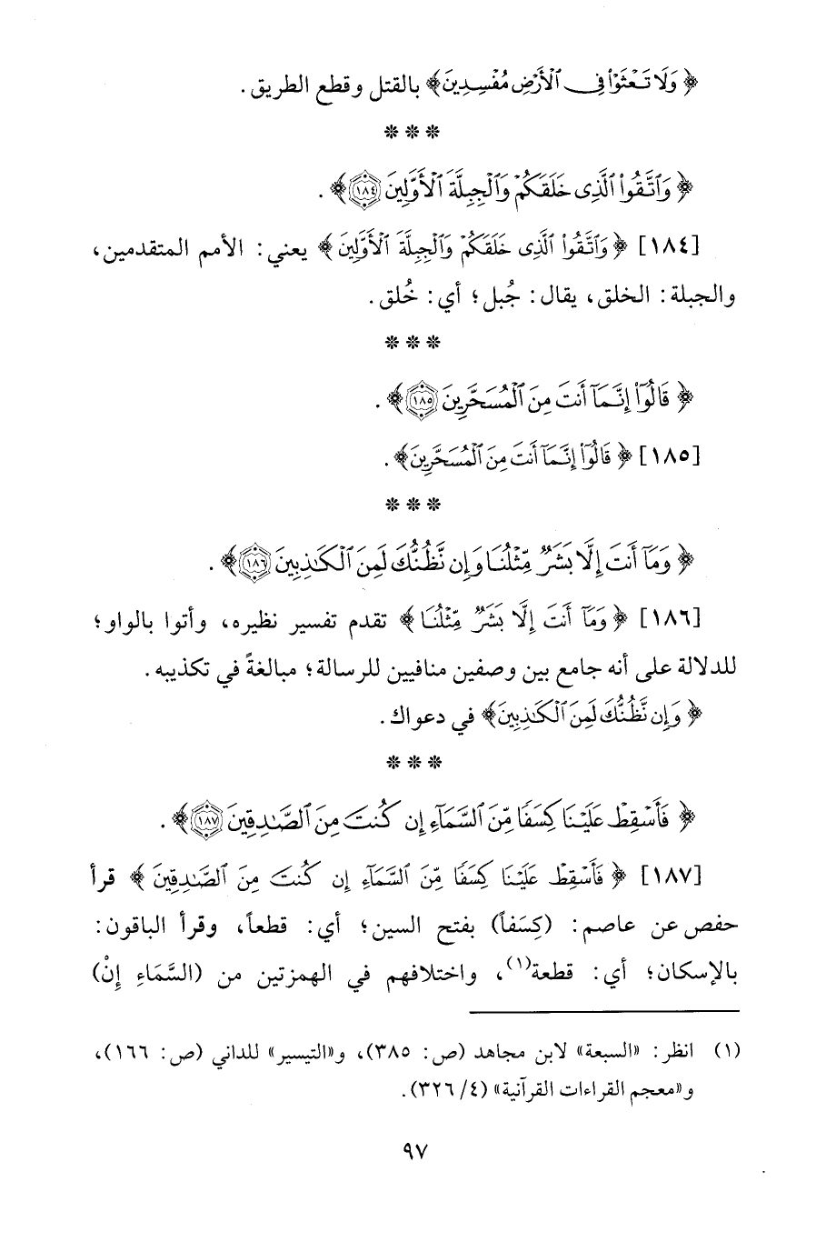 [184] {وَاتَّقُوا الَّذِي خَلَقَكُمْ وَالْجِبِلَّةَ الْأَوَّلِينَ} يعني: الأمم المتقدمين، والجبلة: الخلق، يقال: جُبل؛ أي: خُلق.