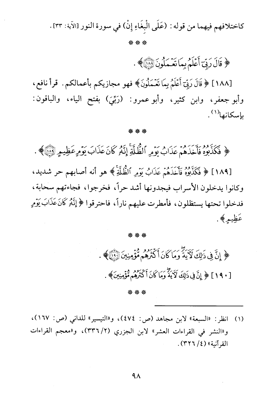 [188] {قَالَ رَبِّي أَعْلَمُ بِمَا تَعْمَلُونَ} فهو مجازيكم بأعمالكم. قرأ نافع، وأبو جعفر، وابن كثير، وأبو عمرو: (رَبِّيَ) بفتح الياء، والباقون: بإسكانها (¬1).