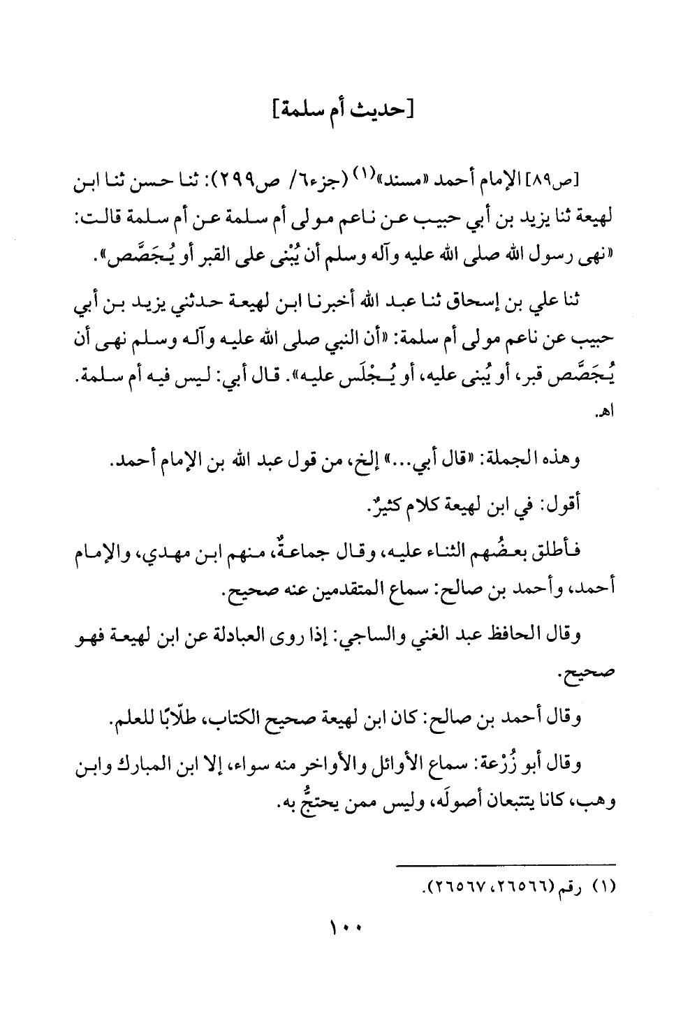 [ص ٨٩] الإمام أحمد "مسند" (¬١) (جزء ٦/ ص ٢٩٩): ثنا حسن ثنا ابن لهيعة ثنا يزيد بن أبي حبيب عن ناعم مولى أم سلمة عن أم سلمة قالت: "نهى رسول الله صلى الله عليه وآله وسلم أن يُبْنى على القبر أو يُجَصَّص".