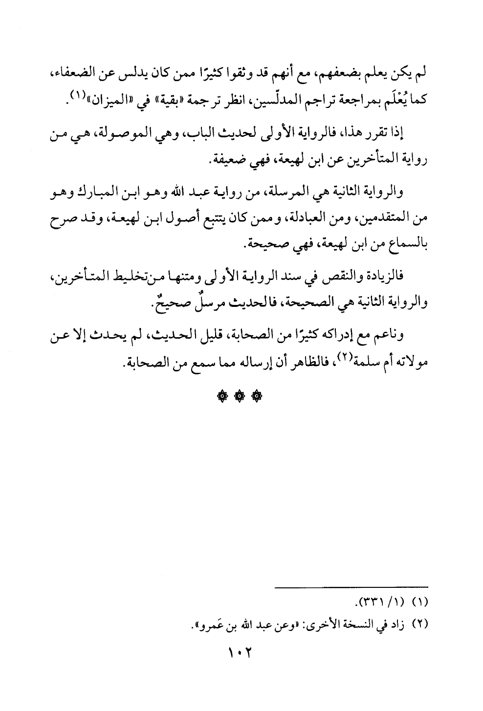 والرواية الثانية هي المرسلة، من رواية عبد الله وهو ابن المبارك وهو من المتقدمين، ومن العبادلة، وممن كان يتتبع أصول ابن لهيعة، وقد صرح بالسماع من ابن لهيعة، فهي صحيحة.